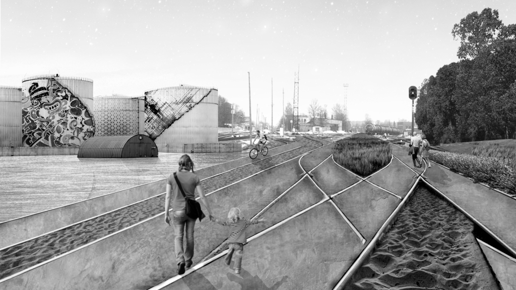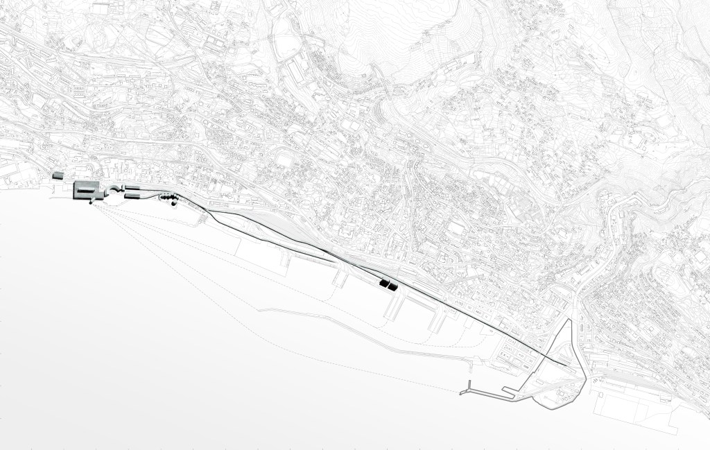 The railway infrastructural line of the European Union that connects the port of Rijeka directly with Zagreb and the nearby countries, stops when it reaches the height of the almost finished container storage platform in the port, this is the ongoing Gateway project , remaining thus in disuse the section that remains to the old industrial network to the Torpedo complex. This section of Rijeka´s port comprises thousands of linear meters of roads that interlock and accompany until they flow into the wharehouses. This section of roads will be the connection vector of the complex with the rest of the city. The train tracks follow a line parallel to the coastline, cordoning off the city, preventing Rijeka from having direct access to the sea front.