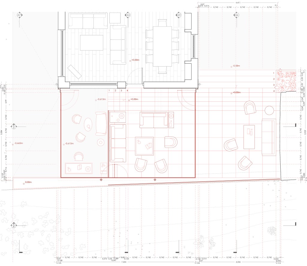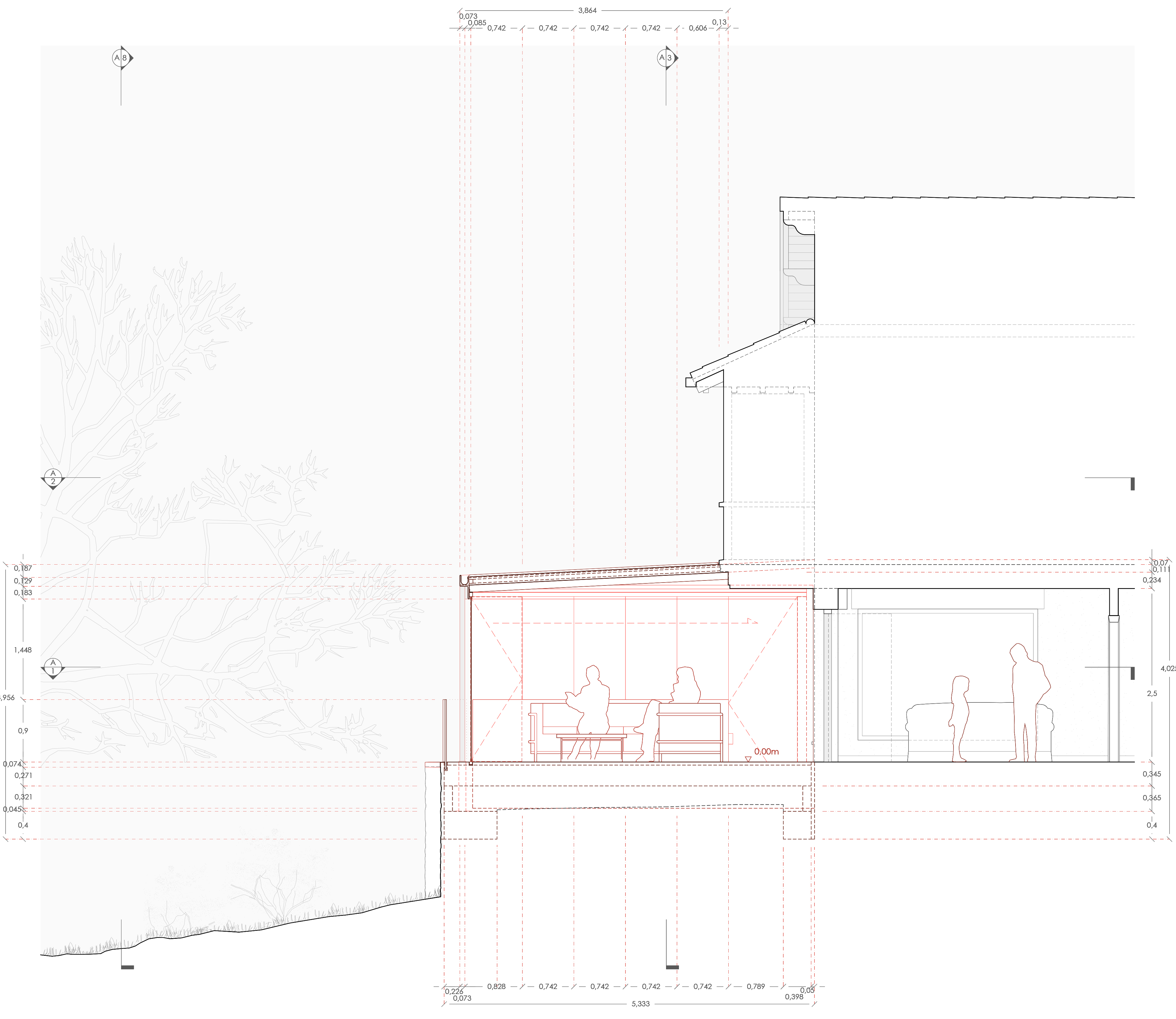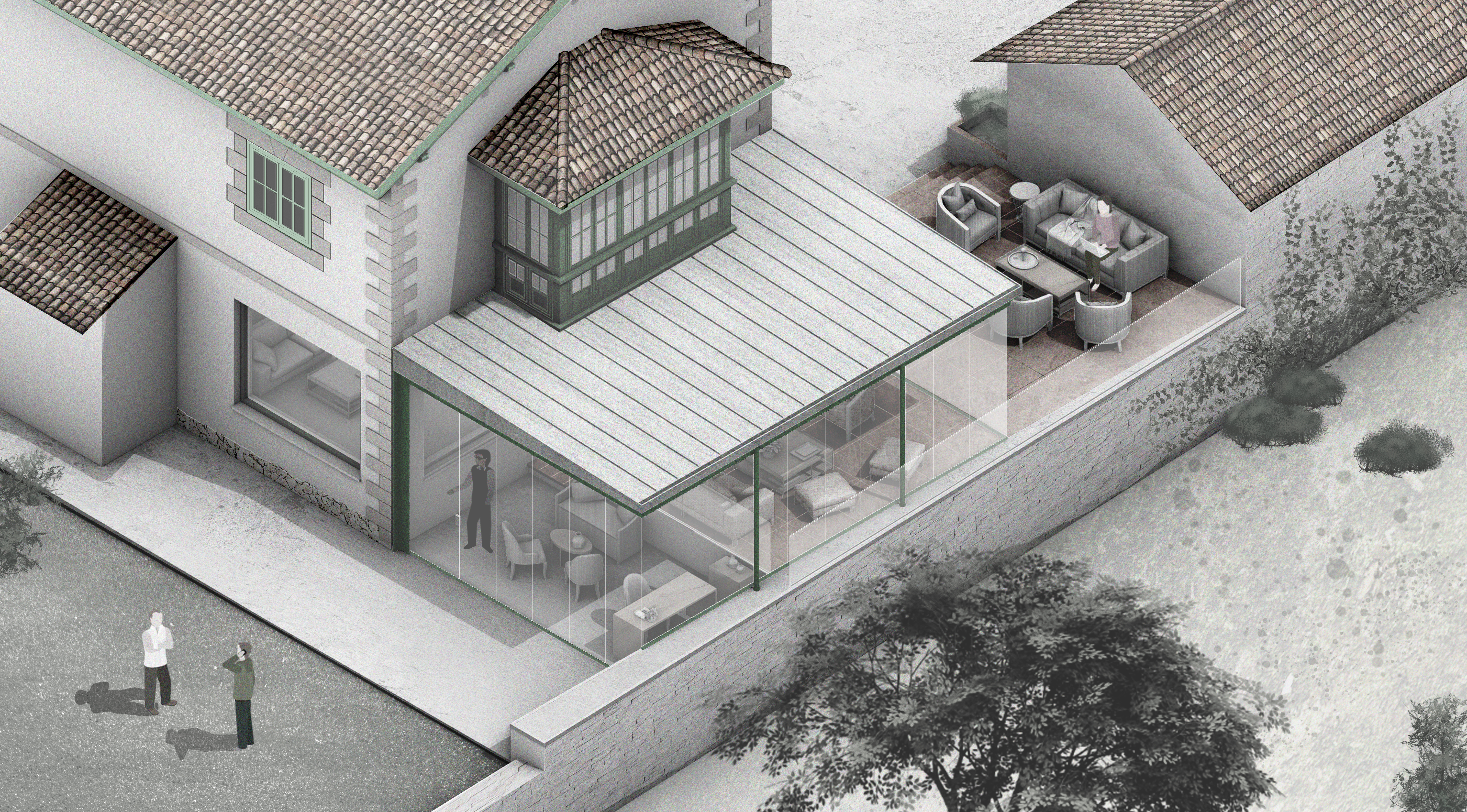 The porch consists of a cink roof on a light steel structure, with cantilevered corners on which a glass curtain system. Under this roof, two spaces coexist simultaneously, spatially differentiated by their level and pavement, each of them closely related to an outdoor space.