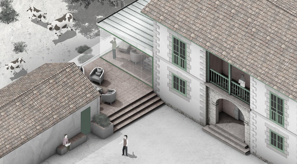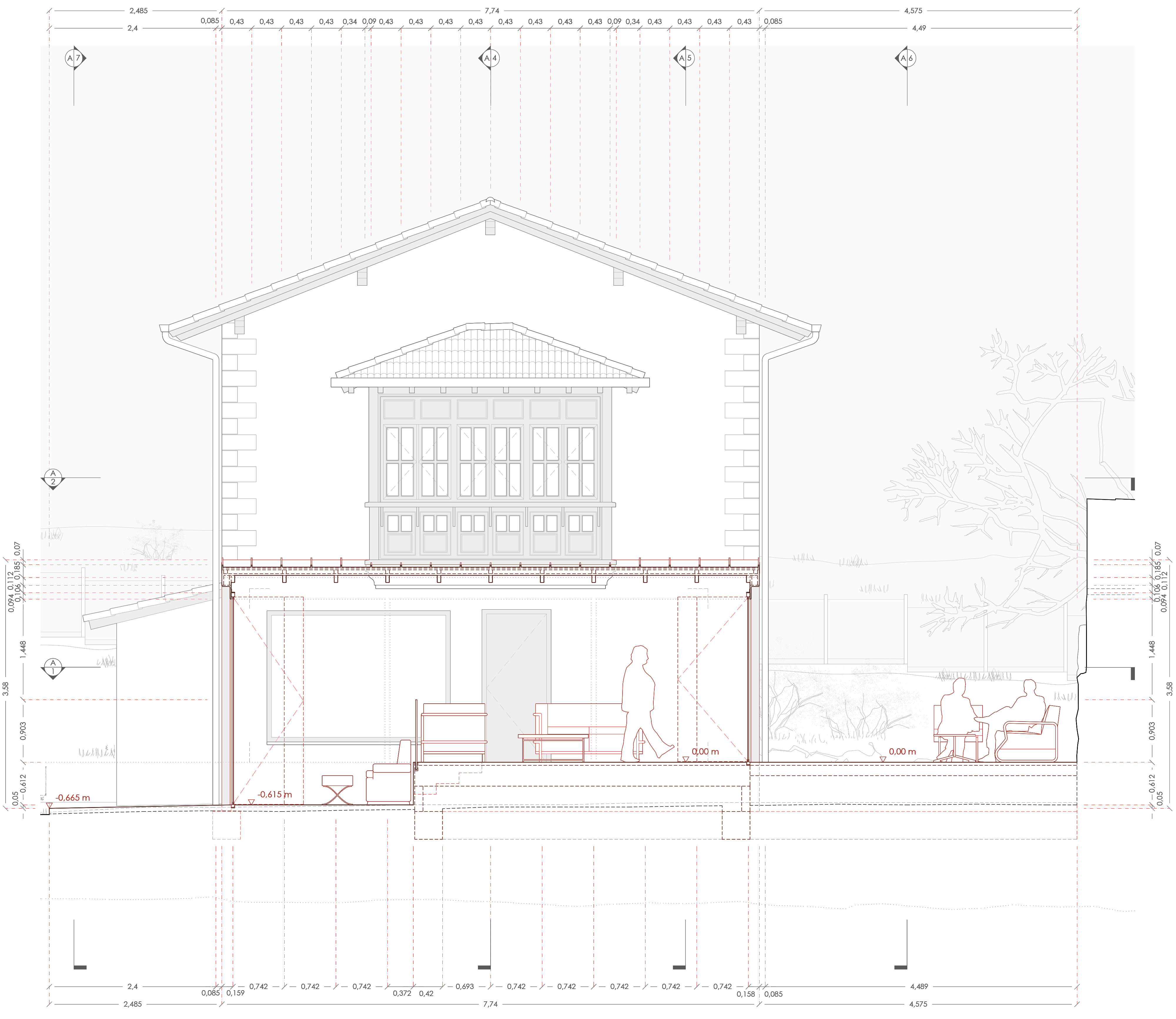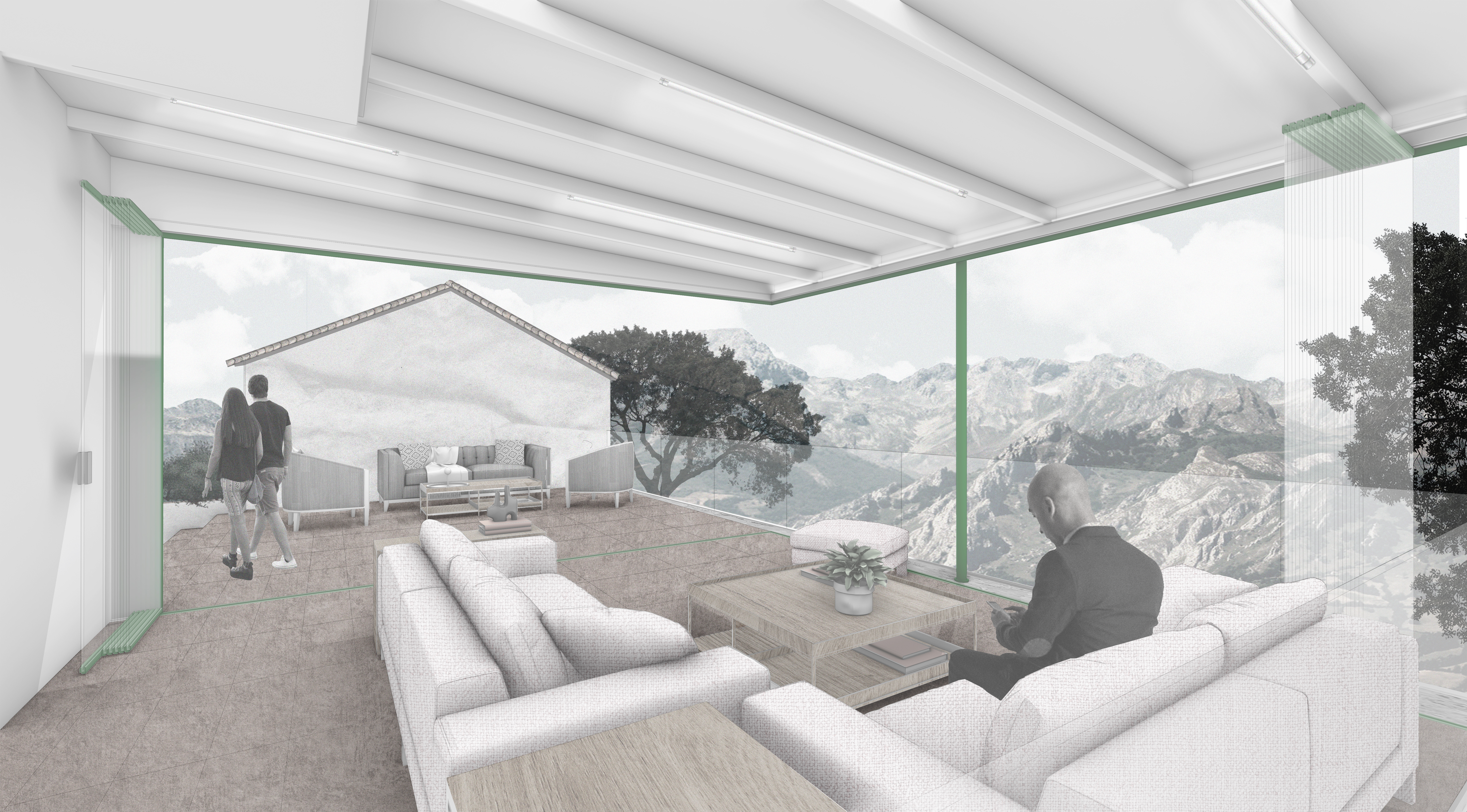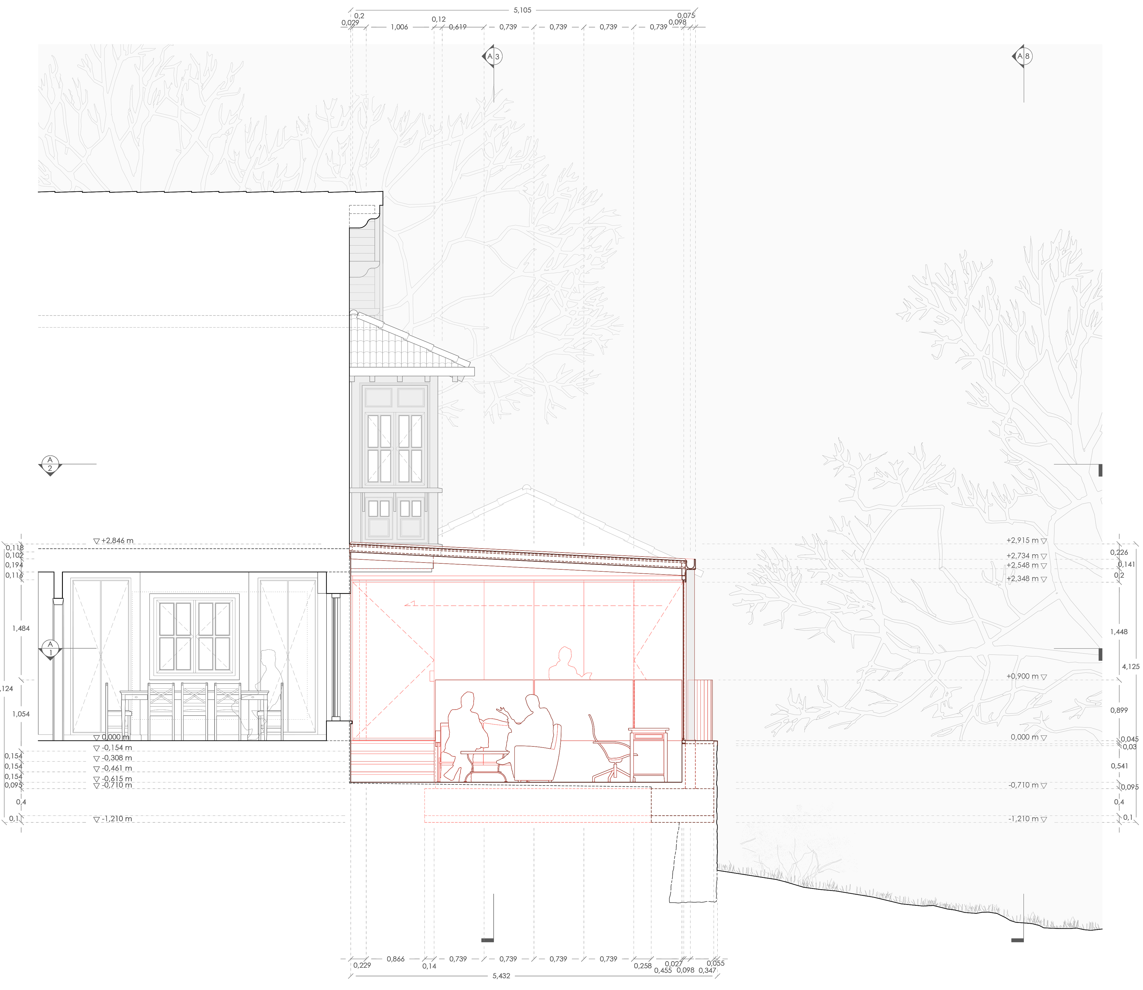 The porch consists of a cink roof on a light steel structure, with cantilevered corners on which a glass curtain system. Under this roof, two spaces coexist simultaneously, spatially differentiated by their level and pavement, each of them closely related to an outdoor space.