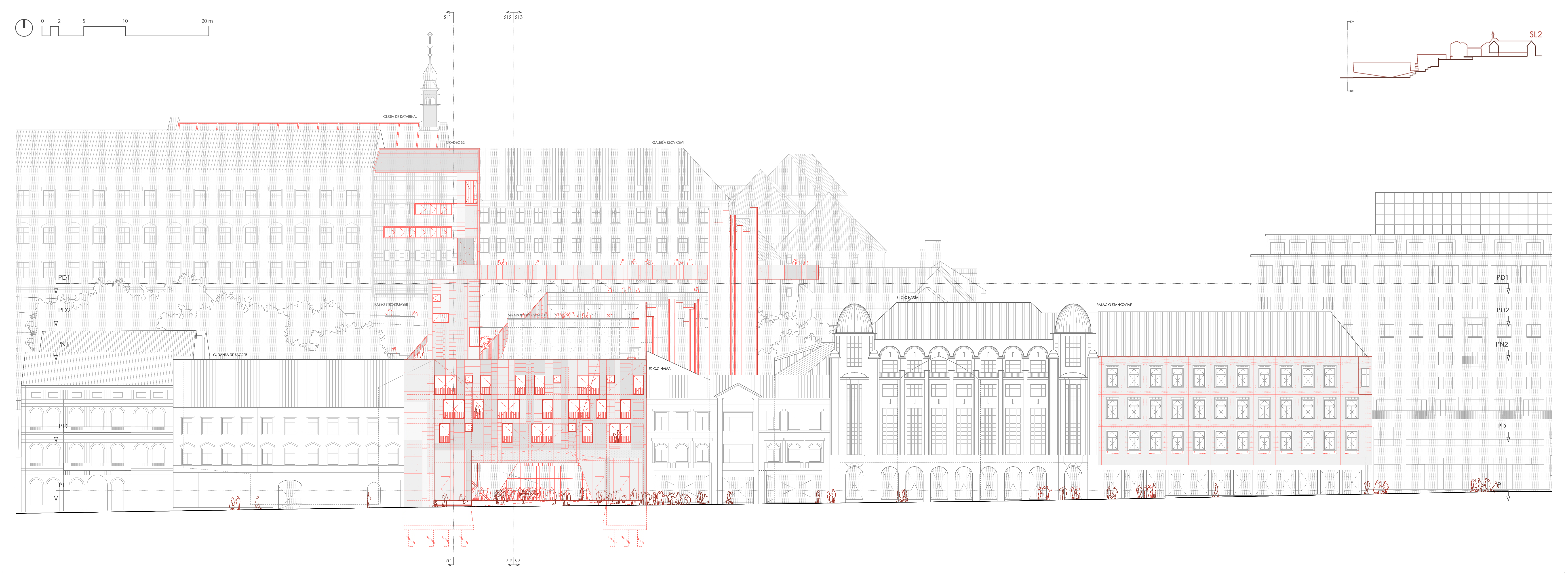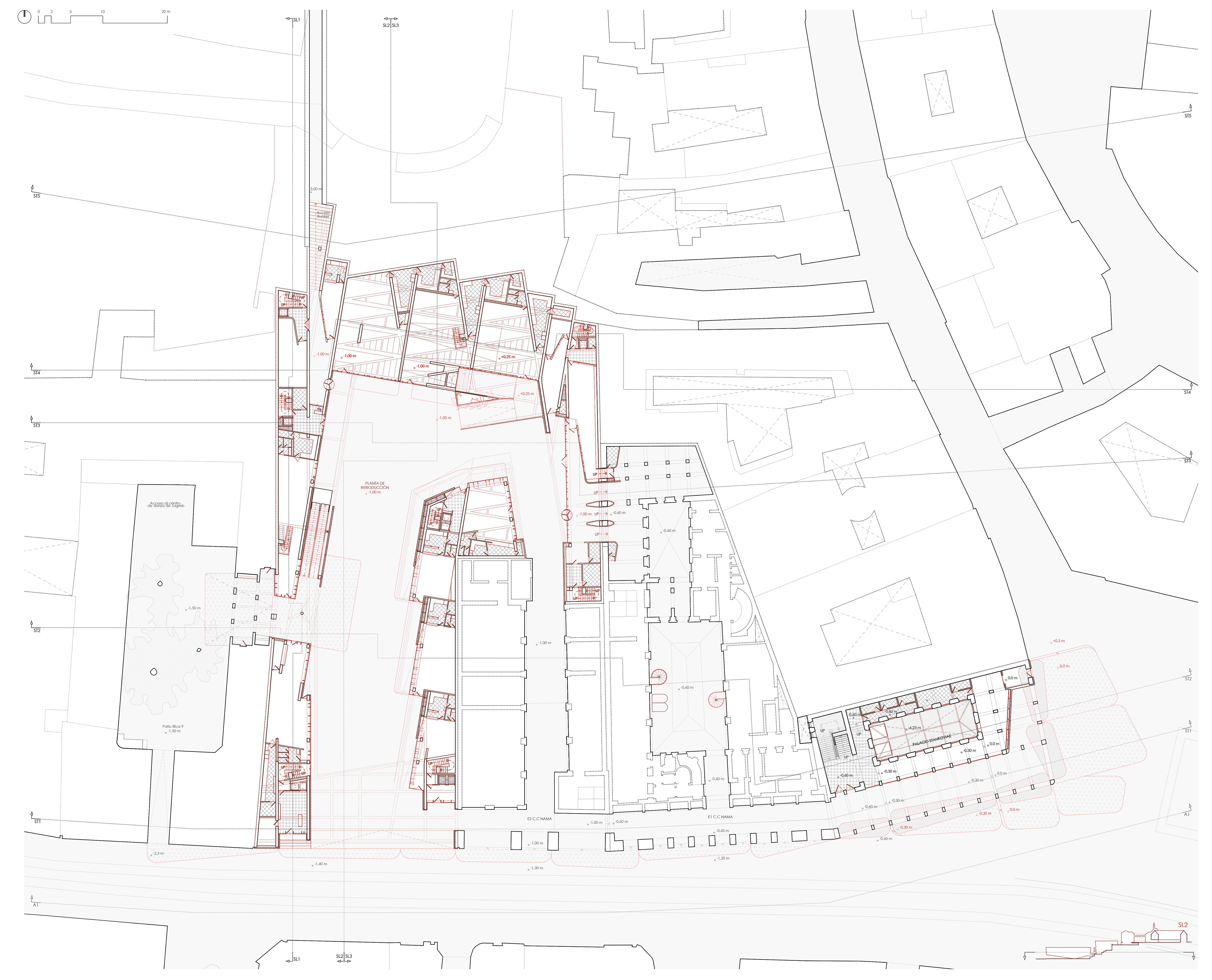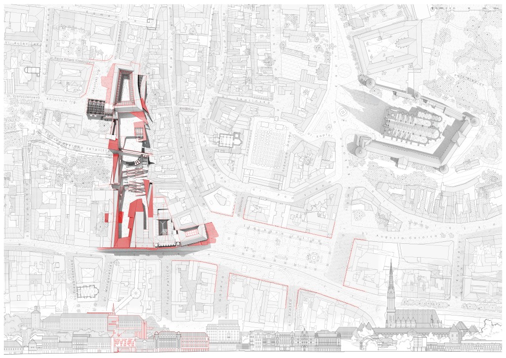 Like most of the cities with medieval origins, Zagreb has an old town, in this case it is fragmented in two. The best connected with the city is, without a doubt, the Kaptol, which is articulated with it through the most important square in the city, where its circulations flow from it´s main streets and squares. The other half of the old town is the Gradec, with poor accessibility due to a great difference in elevation with the lower city and a tortuous access route, with a meager human flow capacity. This town, although not very accessible, contains a large part of the cultural program that the city offers. That is why it is proposed to make all these experiences accessible to inhabitants and tourists through an urban intervention that is committed to a consecrated language in the city: the fragmentation of private space with public space as a wedge.