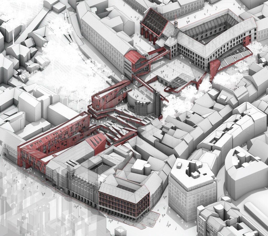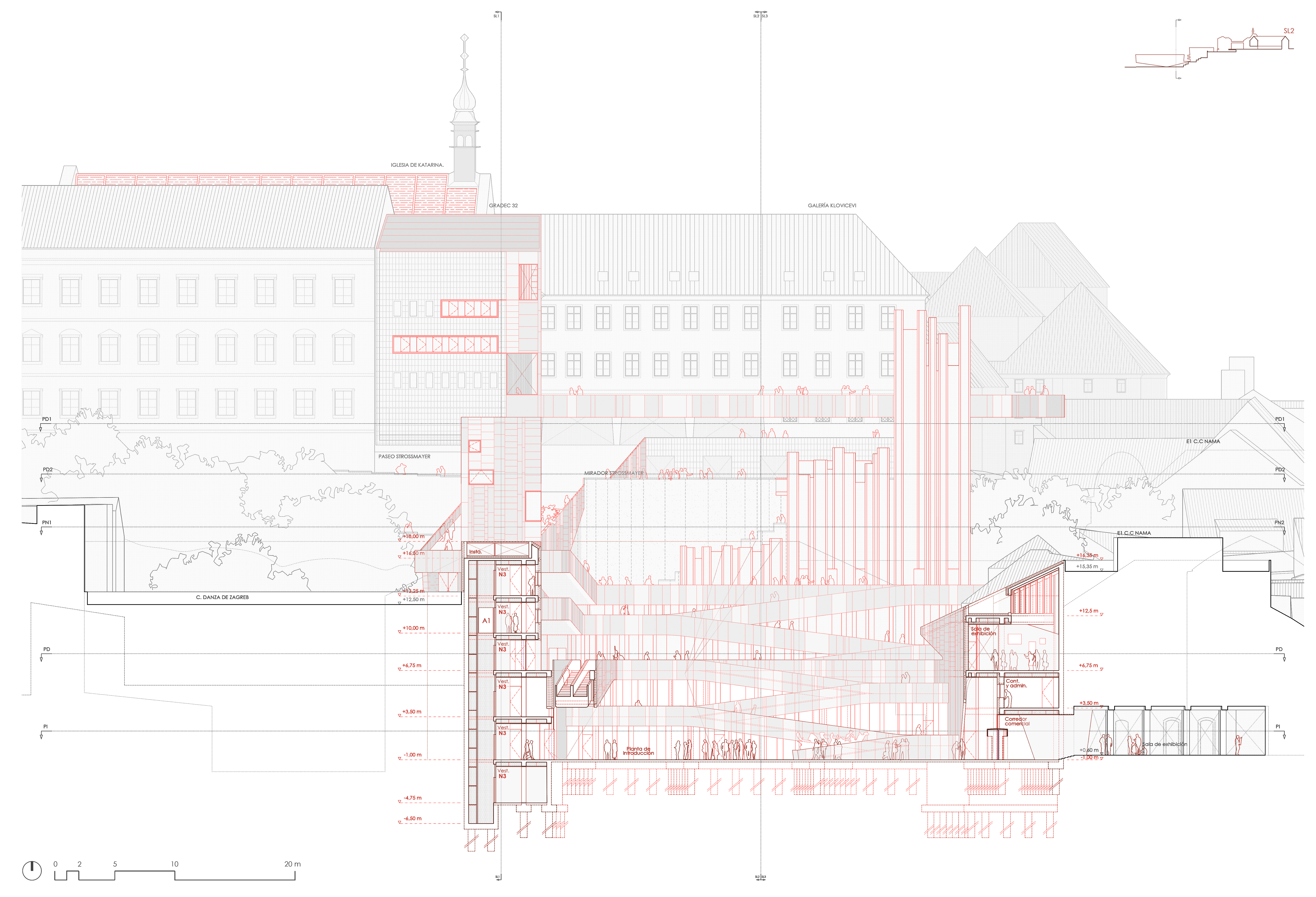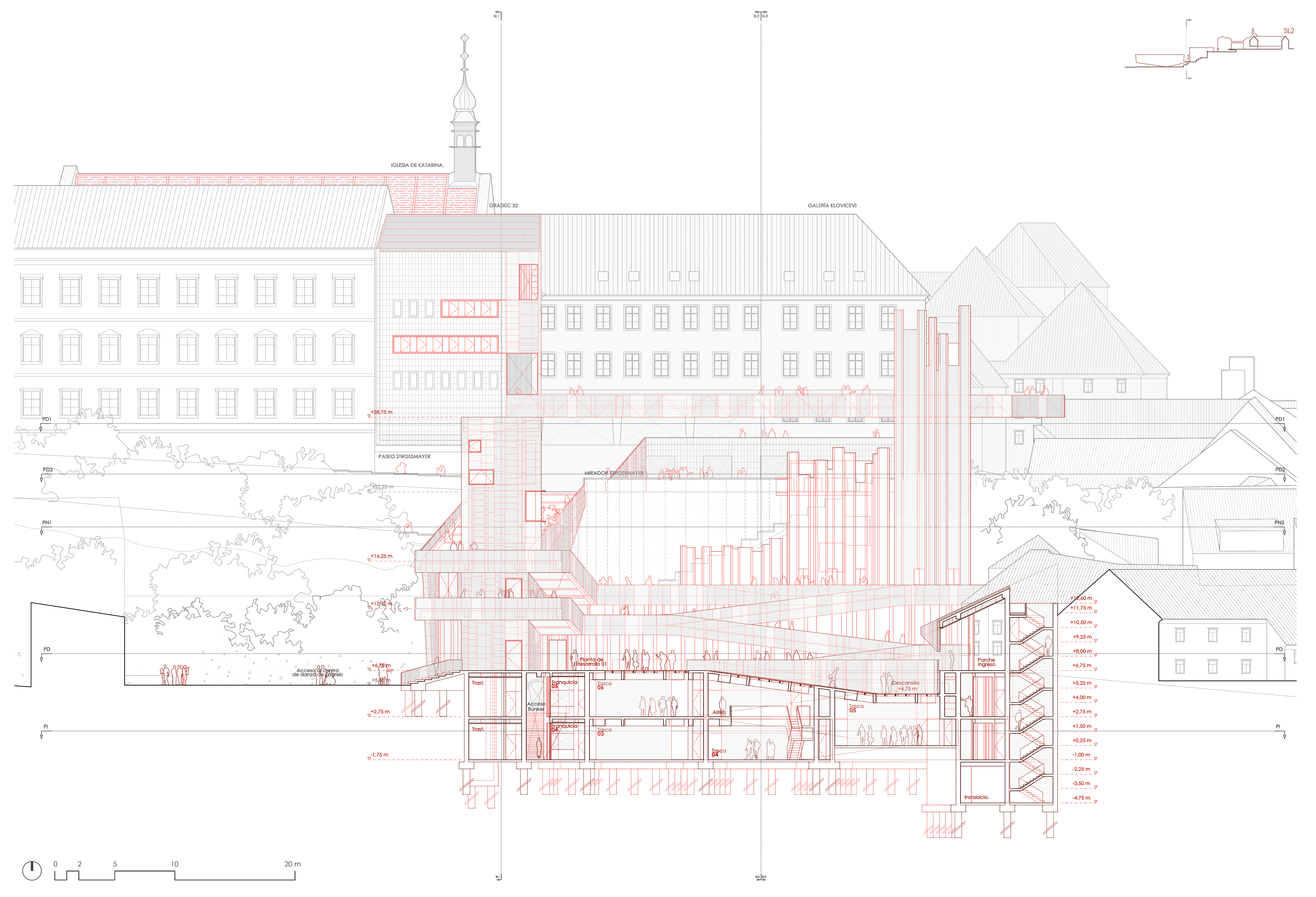 Like most of the cities with medieval origins, Zagreb has an old town, in this case it is fragmented in two. The best connected with the city is, without a doubt, the Kaptol, which is articulated with it through the most important square in the city, where its circulations flow from it´s main streets and squares. The other half of the old town is the Gradec, with poor accessibility due to a great difference in elevation with the lower city and a tortuous access route, with a meager human flow capacity. This town, although not very accessible, contains a large part of the cultural program that the city offers. That is why it is proposed to make all these experiences accessible to inhabitants and tourists through an urban intervention that is committed to a consecrated language in the city: the fragmentation of private space with public space as a wedge.