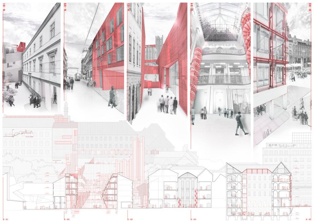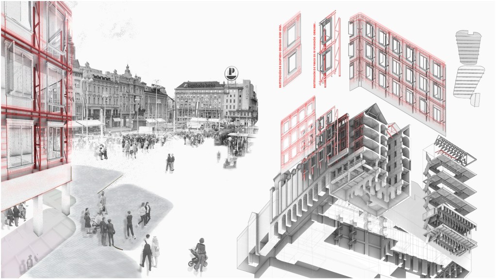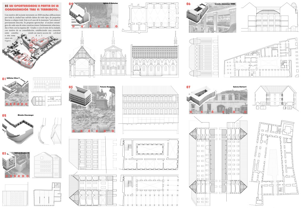 Taking advantage of the strategic location of some of the historic buildings affected by the Zagreb earthquake in 2020, through its consolidation, establishing a forceful connection and constituting a new quality access to this area of the old town, thus preventing it from falling in marginal uses as a result of its original condition.
