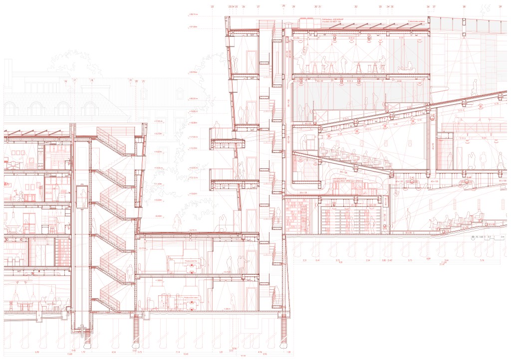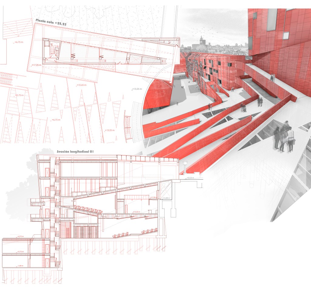 This new public space is structured in three bodies according to their order of elevation: lower, intermediate and upper, sewing 8 pre-existing elements through 4 plaza terraces with wide ramps, elevators and escalators that incorporate the old routes and routes of the block. occupying the site of the now demolished buildings of Illica 9.