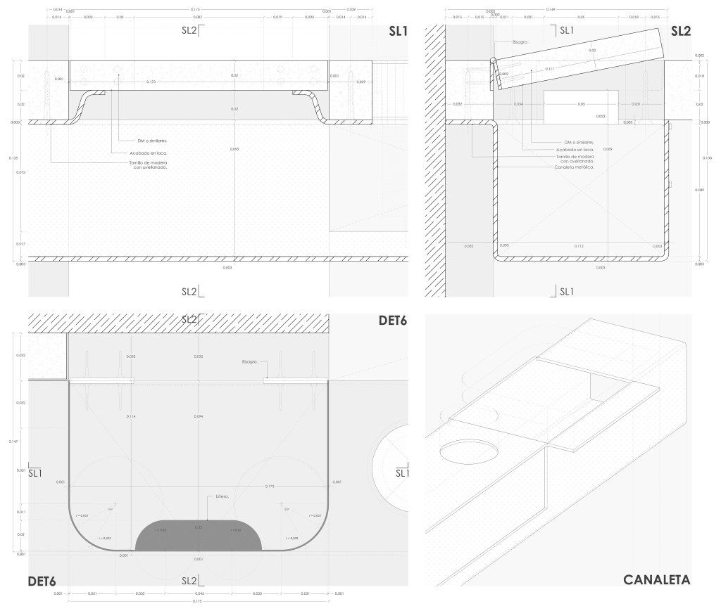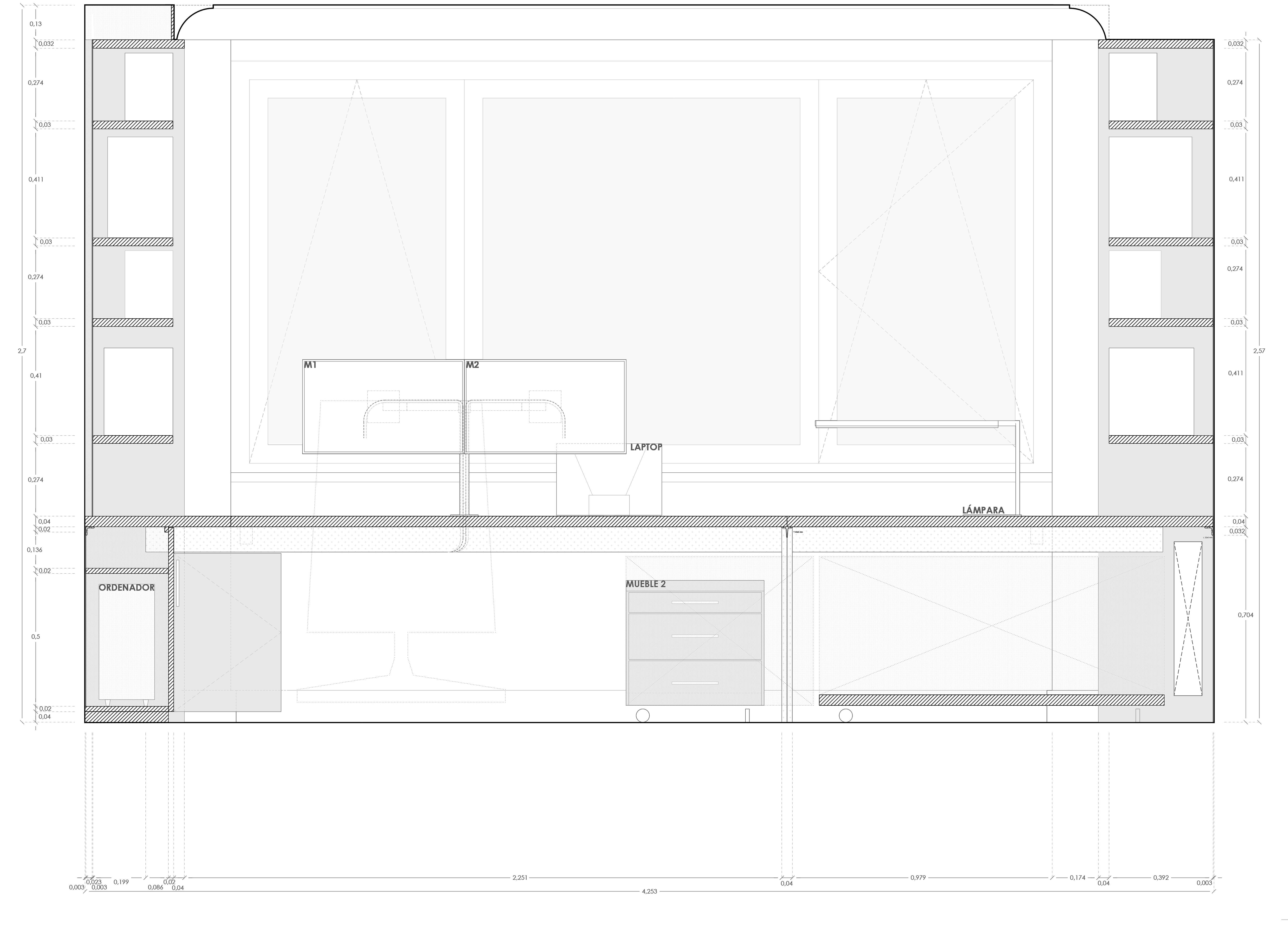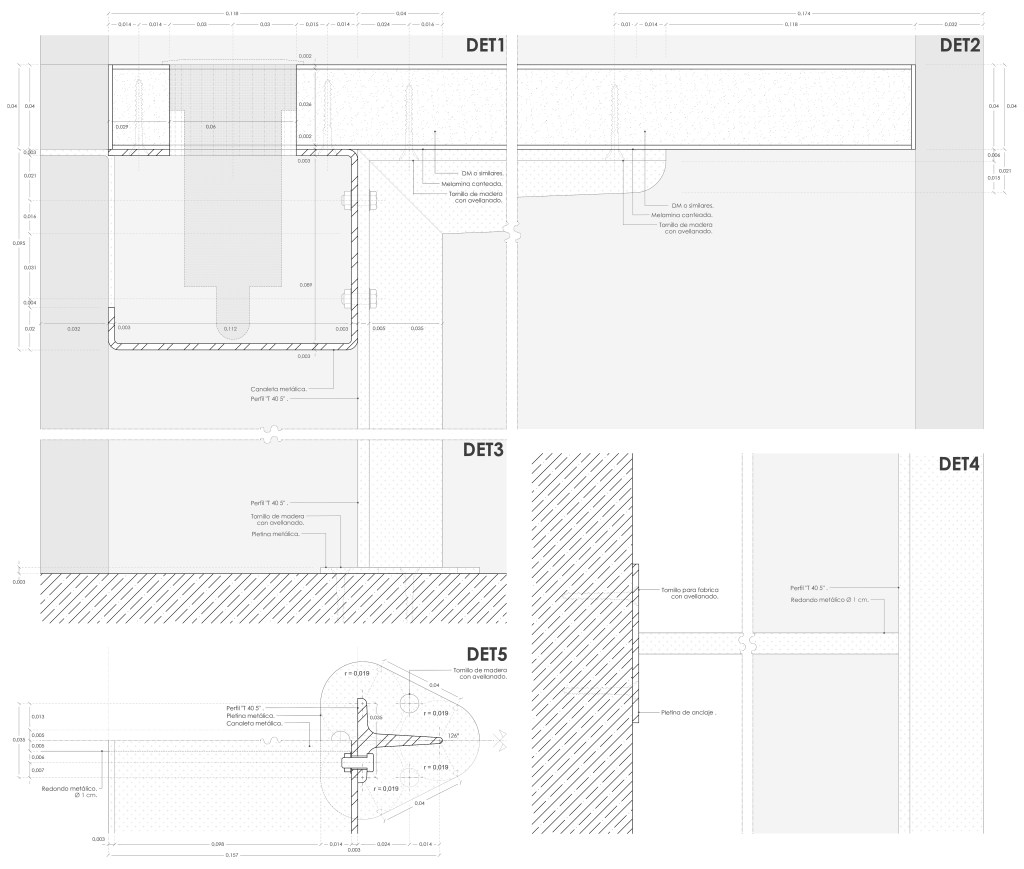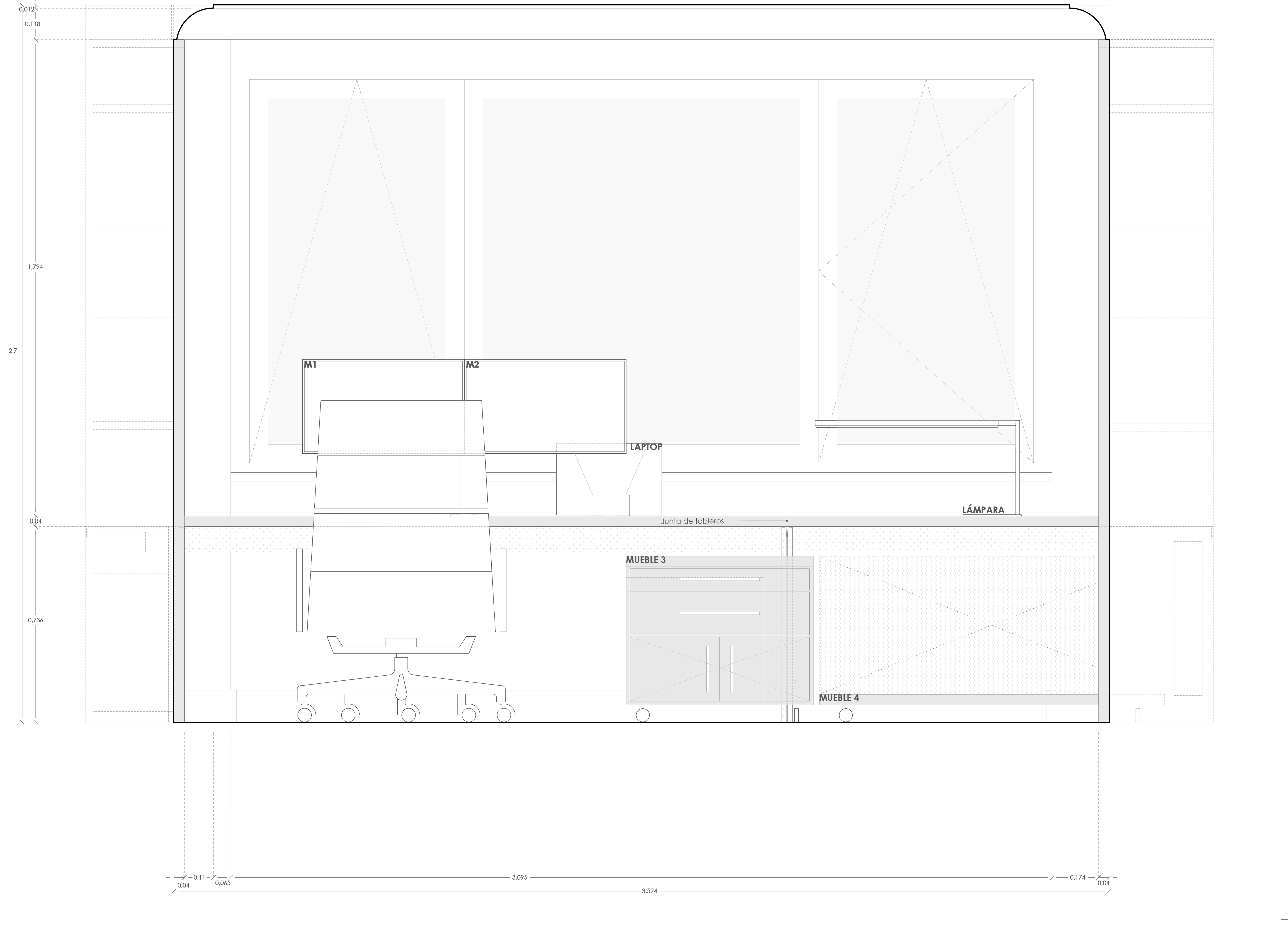 The set has two drawer units with bearings for storing the work area, and a table with bearings to accommodate the plotter. Thanks to the recessed leg, anchored to the wall and with a brace, the additional furniture can be arranged anywhere under the table. A conduit is installed in the back, guiding the peripheral´s cables to a cabinet in the left cabinet, where the plugs are located, providing a cable free workstation.
