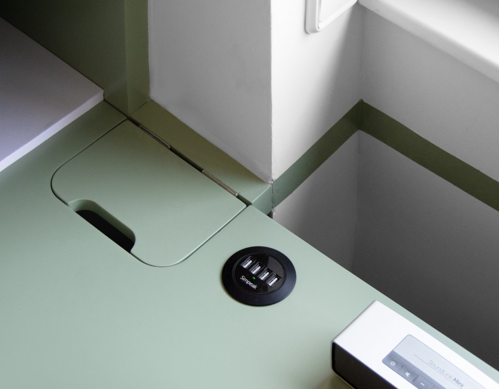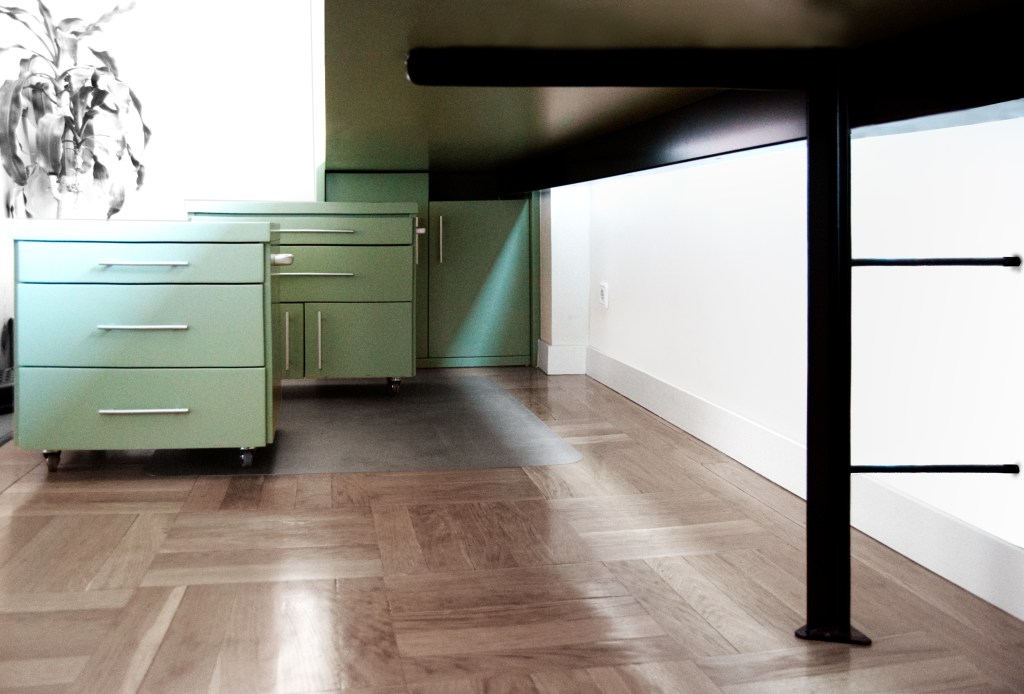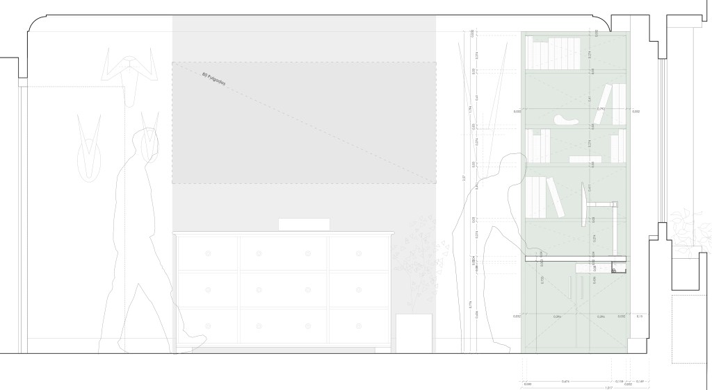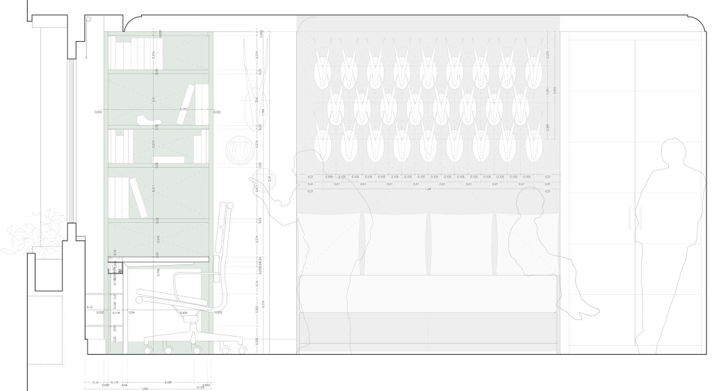 The piece of furniture consists of a tabletop 4 meters long, with an asymmetrical intermediate support and two cabinets for books and documents at the ends, on which the tabletop rests again. All the wood used is MDF lacquered in cactus green with a layer of resin.